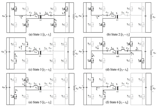 Operating states of the CLLC converter: (a) State 1 [t0–t1]; (b) State 2 [t1–t2]; (c) State 3 [t2–t3]; (d) State 4 [t3–t4]; (e) State 5 [t4–t5]; and (f) State 6 [t5–t6].