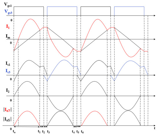 Figure 4 illustrates the theoretical waveforms for each mode during a single switching cycle. Because the configuration of the primary and secondary sides is symmetric, the waveforms of the forward and reverse modes are identical. This symmetric configuration ensures that the power conversion efficiency and the switch control method are maintained constantly regardless of the power flow direction.