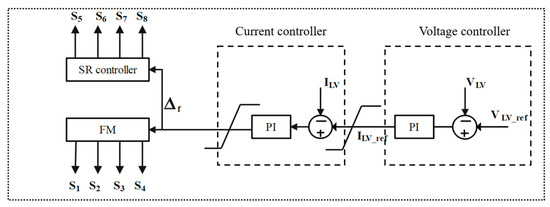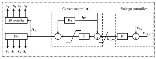 The CLLC converter is designed to achieve stable regulation of the output voltage when the electric vehicle is under a braking state. Conventional algorithms are limited by the long time they take to stabilize the output. Figure 6 depicts the control scheme with a conventional algorithm for the CLLC converter in the forward mode; the scheme includes a voltage control loop, a current control loop, and FM and SR modules.