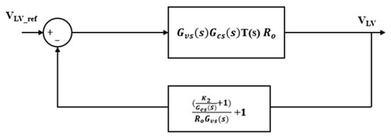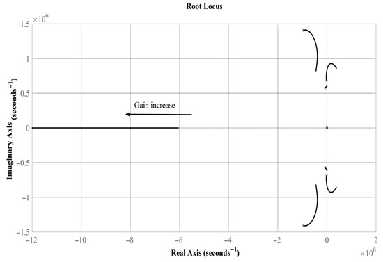The root locus method is applied to design the control system [15]. To maintain the output voltage at a lower value than the maximum voltage with a safety gain of two, the overshoot is set to 20% of the output voltage, and the settling time for the output lower than 2% is set to 2 s. The design specifications are overshoot and settling time . The mathematical expressions for and the transfer functions of the voltage and current controllers, are given by Equation (34) and Equation (35), respectively.