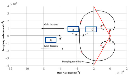 In the plot depicted in Figure 14, the damping ratio is the boundary of the design requirements, and the roots a, b, and c are near the desired location. When the gain increases, the roots will directly move to the left. Conversely, when the gain decreases, the roots directly move to the right, making the closed-loop system unstable. According to the design calculations made for the voltage and current controllers with the gain of current controllers, the roots of the closed-loop system stays on the left side, which satisfies the design requirements.