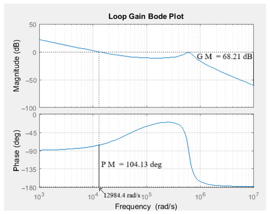 To validate the frequency domain behavior of the proposed digital controller for the bidirectional CLLC converter, the loop gain Bode plot was generated based on the small-signal transfer function derived using the First Harmonic Approximation (FHA). The resulting Bode plot is shown in Figure 15. The open-loop transfer function exhibits a gain margin (GM) of 68.21 dB and a phase margin (PM) of 104.13°, indicating a stable system with good dynamic characteristics. The crossover frequency is approximately 12,984.4 rad/s, which aligns well with the controller’s target bandwidth for electric vehicle applications. This analysis supports the time domain results and confirms that the proposed gain-compensated controller provides both stability and a sufficient phase margin, ensuring robustness under load and line variations.