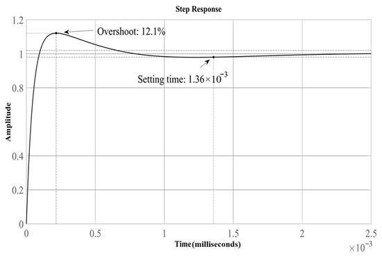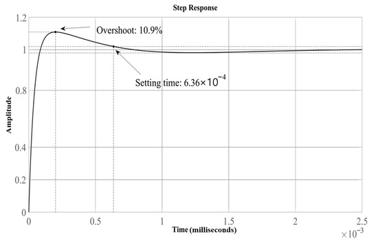 The unit-step response of the CLLC converter with the conventional algorithm features an overshoot of 12.1% and a settling time of s (Figure 16), both of which satisfy the design specifications. The unit-step response of the CLLC converter with the proposed algorithm features an overshoot of 10.9% and a settling time of s (Figure 17), both of which are better than the corresponding values obtained using the conventional algorithm. The control parameters of the system were determined in this section. The SR module, which increases system efficiency, will be explained and analyzed in the next section.