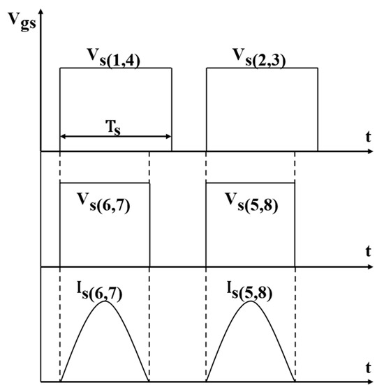 The specific SR regulates the switching phase and duty cycle of the gating signals on the secondary side according to the relationship between the switching frequency and the first resonant frequency . Gating signals corresponding to phase and duty cycle regulation of metal–oxide–semiconductor field-effect transistors on the secondary side under the condition can be expressed as shown in Equation (53):