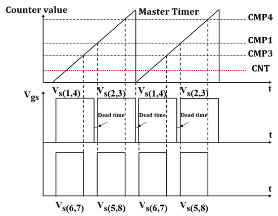 Figure 19 illustrates the control scheme of SR implemented in the microcontroller. Four timers control eight switches of the CLLC converter. The master timer deals with CMP1, CMP3, CMP4, the period, and CNT registers. The operation of the master timer involves the turning on of and as the CNT starts counting up. turns off when the value of CNT exceeds that of CMP3, and turns off when the value of CNT exceeds that of CMP1. The value of CMP1 is calculated assuming a duty cycle of 50%, and the value of CMP3 is calculated from Equation (41). By contrast, and turn off as the CNT reset. turns off when the value of CNT exceeds that of CMP3, and turns off when the value of CNT exceeds that of CMP1. In the next section, the performance of the proposed design in simulations and experiments is presented.