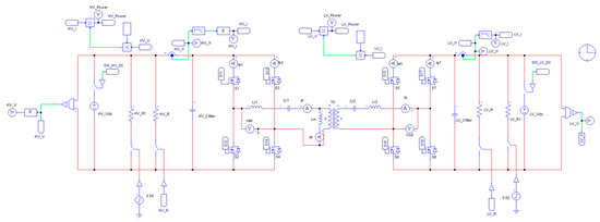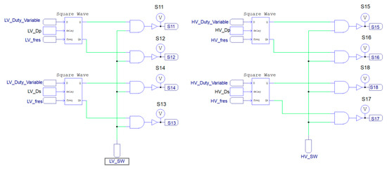 PSIM Professional 2021a.0.5 software was used to simulate the whole system, with a 400 W power rating on both the high- and low-voltage sides. The forward, reverse, and bidirectional modes were simulated using design parameters. The load in the simulation was set to a third of the maximum load. Figure 20 illustrates the model of the bidirectional CLLC resonant converter, constructed based on the theoretical analysis and component values calculated in Section 3.1 and listed in Table 2. The model incorporates all critical elements of the CLLC topology, including two resonant inductors, two resonant capacitors, a high-frequency transformer, input/output filters, and both primary and secondary full-bridge switching networks. Figure 21 presents the simulation model of the gate driver logic, which controls the switching sequences of the MOSFETs on both the high-voltage (HV) and low-voltage (LV) sides. This model generates square-wave gate signals based on frequency variables and ensures the accurate timing and dead-time insertion required for safe and efficient switching. These gate signals are then applied to the main switches to achieve the intended resonant operation and enable zero-voltage switching (ZVS) conditions.