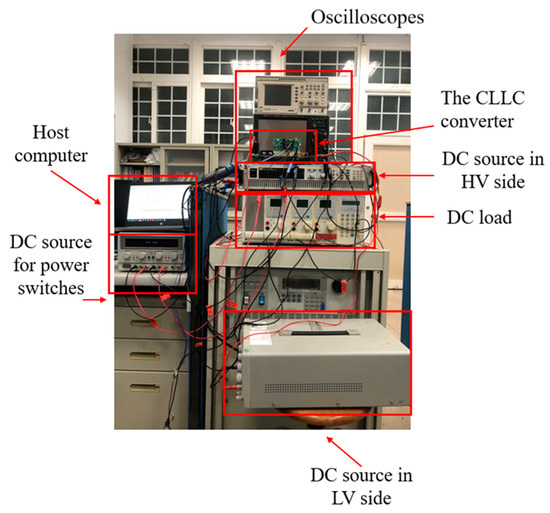 The experimental prototype of the CLLC converter was built based on the simulation model. A 32-bit microcontroller (Arm Cortex, STM32G474RET6, STMicroelectronics, Geneva, Switzerland) was used to serve as the PI voltage and PI current controller. The experimental setup is illustrated in Figure 22.
