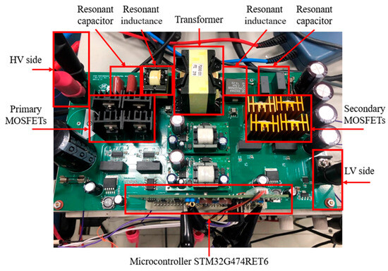 The prototype of the CLLC converter engineered in this study is displayed in Figure 23. The forward and reverse modes are operated at 400 W with a resonant frequency of 70 . The CLLC converter is designed according to the specifications listed in Table 2.