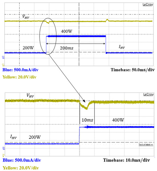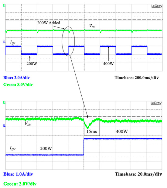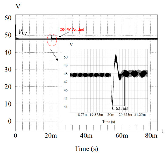 Figure 24 and Figure 25 show the simulation and experimental waveforms of output voltage at 48 V by the proposed algorithm, respectively. In a steady state, the output voltage reaches the reference voltage stably. When the load is increased from 200 W to 400 W, the output voltage drops and then returns to the reference voltage shortly. The simulation and experimental results of settling time are 0.625 ms and 15 ms, respectively. On the contrary, the voltage introduces overshot when the load is taken off, but it also returns to the reference voltage shortly. It is obvious that the settling time determined by using the proposed algorithm is shorter than that by the conventional algorithm.