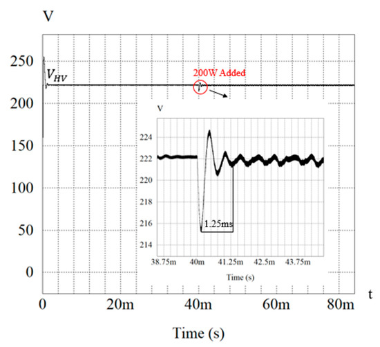 Figure 26 and Figure 27 show the simulation and experimental waveforms of output voltage at 222 V by the proposed algorithm, respectively. In steady state, the output voltage reaches the reference voltage stably. When the load is increased from 200 W to 400 W, the output voltage drops and then returns to the reference voltage shortly. The simulation and experimental results of settling time are 1.25 ms and 10 ms, respectively. It is obvious that the settling time determined by using the proposed algorithm is shorter than that by the conventional algorithm.