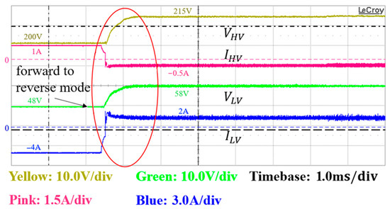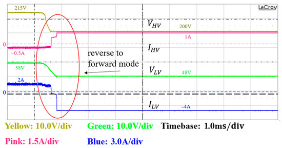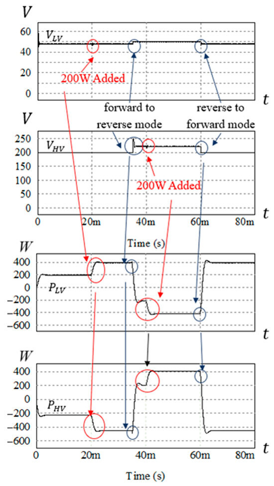 Figure 28 depicts the simulated waveforms of the mode change between the forward and reverse modes. The converter operated in the forward mode from 0 to 0.035 s and from 0.06 to 0.08 s; it operated in the reverse mode from 0.035 to 0.06 s. In the forward mode, the load increased from 200 W to 400 W at 0.02 s, and the output voltage was damp at first but returned to the steady state within a short duration. At 0.035 s, the voltage on the secondary side increased to 58 V, which was higher than the reference voltage of 48 V, prompting the converter to switch to the reverse mode. In the reverse mode, the reference voltage was 215 V, and the load was increased from 200 W to 400 W at 0.04 s. Again, the output voltage was damped at first but returned to the steady state within a short duration. The voltage on the secondary side decreased at 0.06 s, and the DC source on the primary side began to transfer power to the battery on the secondary side; therefore, the converter switched back to the forward mode and continued charging the battery on the secondary side.