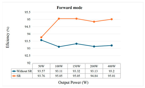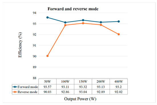 The CLLC converter operated at a power ranging from 50 W to 400 W. The conversion efficiency plots are presented in Figure 31 and Figure 32. Figure 31 depicts the conversion efficiency in the forward and reverse modes without SR. The conversion efficiency peaked at 93.57% in the forward mode and 93.04% in the reverse mode. Figure 32 depicts the conversion efficiency in the forward mode with and without SR. The efficiency was 93.11–93.57% without SR and improved to 93.76–95.05% with SR. The presence of SR significantly enhanced the conversion efficiency in the forward mode. In this implementation, the transformer’s primary side corresponds to the high-voltage side, while the secondary side operates at a lower voltage and therefore carries a higher current. In the forward mode, the resonant tank is located on the primary side, and synchronous rectification on the secondary side—where the current is higher—offers a clear efficiency benefit. However, in the reverse mode, the resonant tank shifts to the secondary side, and the high-voltage primary side carries a lower current. As a result, implementing SR provides limited efficiency gains in the reverse mode.