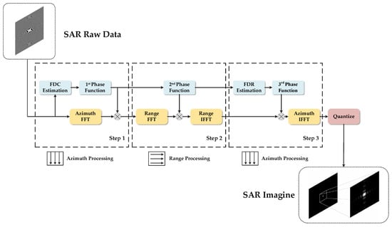 In the field of SAR imaging processing, the Chirp Scaling Algorithm (CS algorithm) is one of the most popular spaceborne SAR imaging algorithms. Compared with other imaging algorithms, the CS algorithm is characterized by high processing accuracy, strong noise resistance, and a fast imaging speed. Additionally, the CS algorithm mainly consists of operations such as Fast Fourier Transform (FFT), Inverse Fast Fourier Transform (IFFT), and complex multiplication, which can be implemented on hardware platforms like FPGAs and ASICs to provide high processing precision [27]. Therefore, the CS algorithm has become a popular choice for the on-board real-time imaging processing of spaceborne SAR.