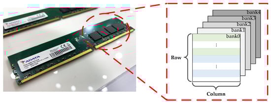 During the SAR imaging processing, a large amount of raw echo data and intermediate processing data need to be stored. DDR4 SDRAM is currently the ideal off-chip storage medium for the real-time processing of spaceborne SAR. As a storage chip, DDR4 SDRAM can be regarded as a matrix storage sequence composed of banks, rows, and columns. Each bank consists of many rows and columns, and the position determined by the intersection of each row and column is called a storage cell. The schematic diagram and physical image of DDR4 SDRAM are shown in Figure 2 [28].