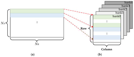 In DDR4 SDRAM, raw SAR echo data are stored in a matrix format, where the range direction corresponds to rows in DDR4 and the azimuth direction corresponds to columns. The storage mapping process is shown in Figure 3 [32].