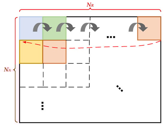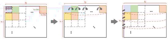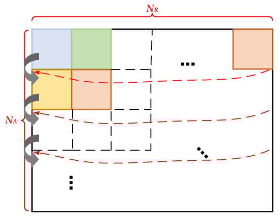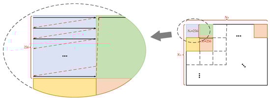 The “three-dimensional cross-mapping transposition method based on matrix partitioning” is one of the classic transposition methods in the field of SAR imaging processing. In this section, we first take the classic application scenario of using this method for transposition as an example to analyze the address change patterns of the DMA engine when reading and writing SAR data during the transposition process. According to the specific content of the transposition method, a complete image dataset of NR × NA × 64 bits can be divided into several 256 × 256 submatrix blocks, as shown in Figure 4, where NR corresponds to azimuth-direction data and NA corresponds to range-direction data.