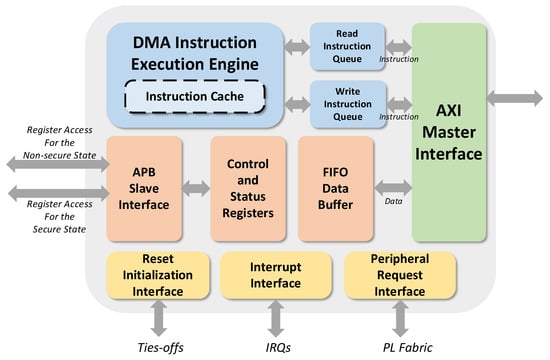 Currently, the ARM PL330W_DMA is widely used in spaceborne SAR real-time imaging processors. Designed by ARM specifically for embedded systems, its versatile architecture makes it suitable for various applications, including multimedia processing, network communication, and SAR imaging. As a critical component for high-performance data transfer [37], its hardware structure is illustrated in Figure 9.