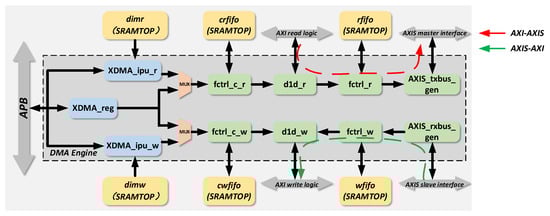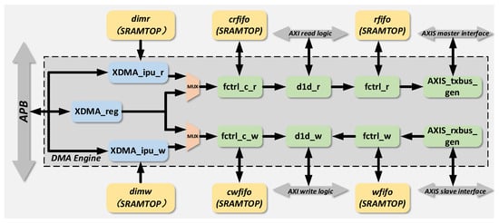 For common SAR real-time imaging processors with pipeline architecture, their data processing speed is directly constrained by the bandwidth of the storage subsystem. Therefore, improving the bandwidth of the processor’s storage subsystem is of great significance for enhancing the processor’s imaging speed. In the processor’s storage subsystem, the DMA engine plays a critical role in data access and scheduling, serving as a key module in the storage subsystem [14,15,16]. After receiving transmission instructions from the CPU, the DMA directly accesses system memory and peripherals to complete data transfer between them without CPU intervention, acting as the sole bridge for high-speed transmission of large volumes of data between peripherals and memory in the processor. Therefore, the performance of the DMA engine directly determines the bandwidth of the storage subsystem [17,18].