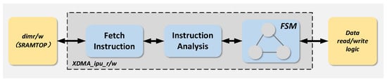 (2) Based on the innovative dedicated instruction set, we proposed a spaceborne SAR-specific state machine and designed a novel DMA engine hardware architecture. This architecture includes functional modules such as the ipu_r/w module for instruction fetching, decoding, and state machine control and the d1d_r/w module for AXI interface read/write operations. The entire DMA engine integrates one set of AXI_stream master interfaces, one set of AXI_stream slave interfaces, one set of AXI_full master interfaces, and one set of AXI_full slave interfaces.