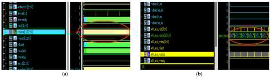 Transmission waveform comparison of two DMA Models. (a) Simulation results of the XDMA engine operation. (b) Simulation results of the pl330w_DMA engine operation.