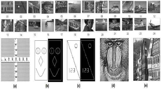 The data set used to analyze the proposed algorithms was labeled 1 to 24, starting with the top left image. The last row (a–e) contains the original image that serve as visual references to compare the proposed algorithm with other algorithms.
