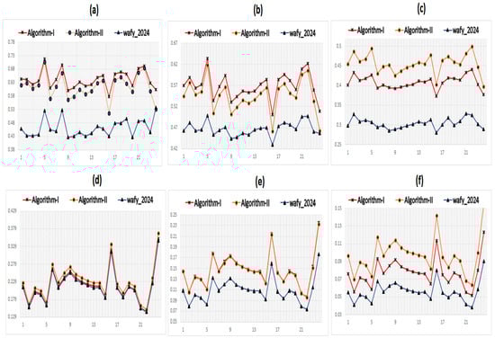 The top row shows the Wafy [] (Algorithm 1) for  in (a–c). The bottom row shows the Algorithm 2 for  in (d,e) and the Algorithm 3 in (f).