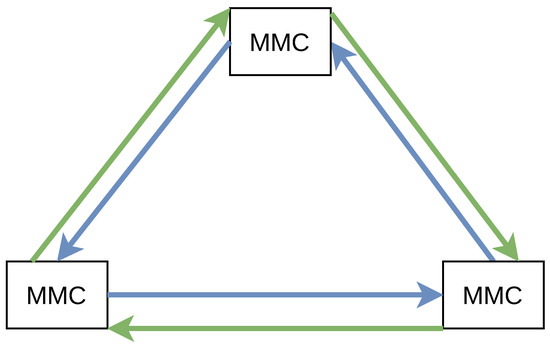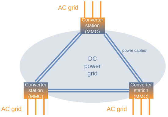 The basic MVDC grid scenario is shown in Figure 1 based on the topology given in ref. [8]. As proposed by the authors, the MVDC grid is established by converter stations, the Modular Multilevel Converter (MMC). The MMCs establish control and protect the AC and DC grid, also in cases of unexpected fault conditions [10]. Figure 1 exemplarily shows three MMCs that are fully interconnected via DC power cables. However, other configurations with a different amount of MMCs or an altering power grid topology are possible. Each MMC is also connected to a conventional three-phase AC grid.