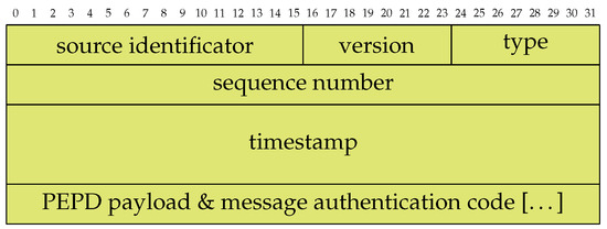 The PBPF is shown in Figure 3 as a protocol specification. The size of the fields correspond to the length and height of the cells in bits. Since PULLSE is designed for synchronizing a closed group of components, the communication data does solely require a source identifier field. Any other component in the same group is a destination by implication. Each packet furthermore contains a packet version field which allows the definition of different versions of one packet accordingly. The type field describes the content of the PEPD payload and message authentication code (MAC) fields. According to a given type identifier, the sender builds the message and protects it with a given MAC. The packet-wise sequence numbers are used to prevent replay attacks and to identify already known exchange packets. The timestamp is described as a 64-bit-value and is consequently capable of providig very high time resolution depending on the use case. For instance, it would provide microseconds accuracy without overflowing in over 580 thousand years.