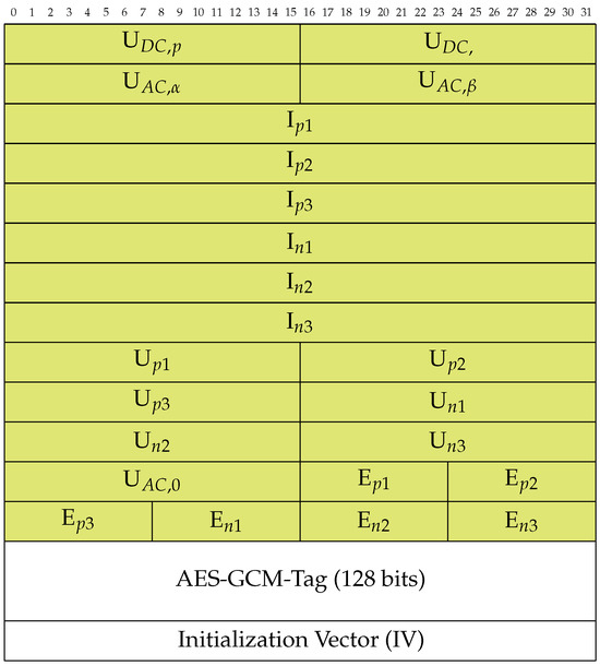 PEPD format for the state exchange of MMCs in an MVDC grid (green fields are encrypted and integrity protected). The names of the variables correspond to the names in Section 2.1. The numbers on the figure’s top indicate bit lengths with each row consisting of 32 bits of data.