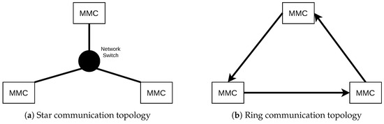 Figure 5 shows two possible communication topologies (using Ethernet) for the state exchange system in the context of our MVDC grid scenario with three MMCs/nodes discussed in Section 2. We propose both, the star topology (cf. Figure 5a) and the directed ring topology (cf. Figure 5b) as being suitable as we expect both to offer a good trade-off between performance, maintainability and topological extensibility.