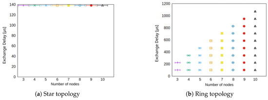 The directed ring topology, however, may perform worse with an increasing number of nodes. The maximum delay for the ring in seconds for is expected to be as shown in Equation (2).