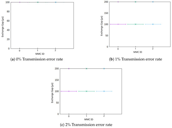 Different use cases have different requirements in terms of acceptable maximum values for the ED and EG. The acceptable maximum ED in the MVDC grid use case depends on the grids dimensions and is expected to increase in a linear manner with the distance two MMCs have to each other, due to the lag of the spreading current in power faults. The EG on the other hand indicates the effectiveness of the communication and increases with an higher transmission error rates. The best possible value for the sync gap is the send interval, i.e., . The PULLSE approach consequently tolerates erroneous packet transmissions as long as the resulting EG still satisfies the use case’s needs.