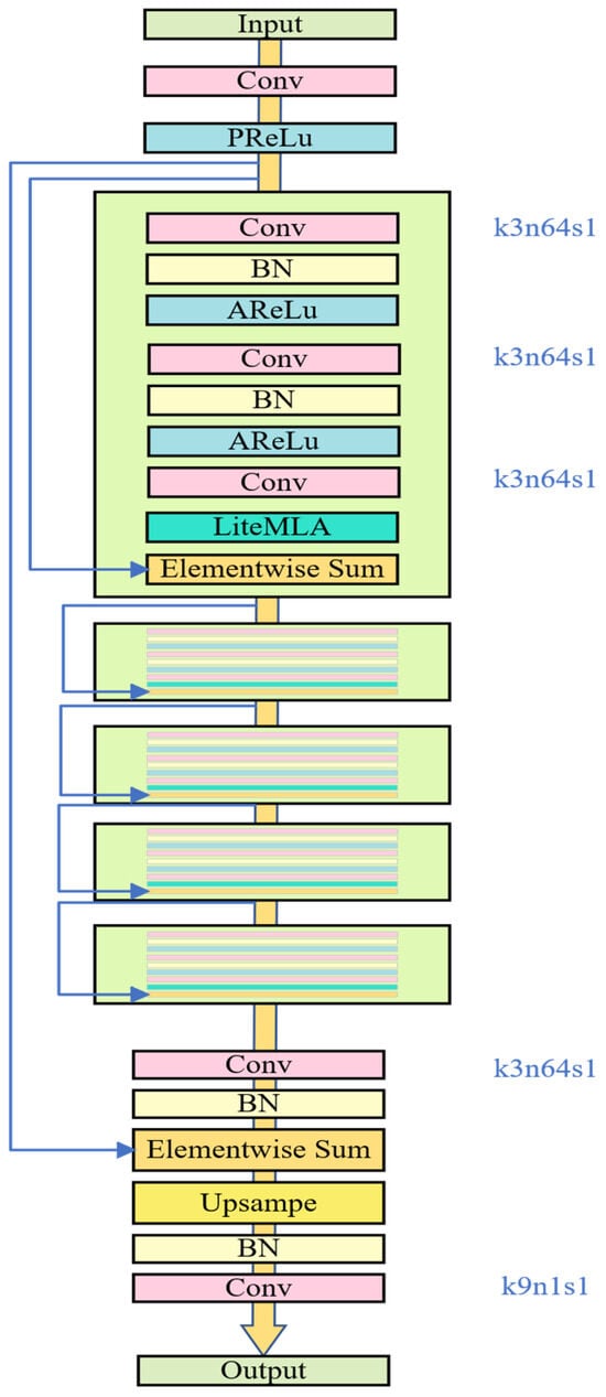 Super-resolution reconstruction technology mainly includes three methods: interpolation-based, reconstruction-based, and learning-based [5,6,7]. The learning-based method is further divided into shallow and deep learning [8,9]. The interpolation-based method improves the resolution by adding pixels in the enlarged image, but there is a problem with blurred image edges and details. The various classical algorithms based on reconstruction and shallow learning proposed later, although they effectively enhance the quality of reconstructed images, require a lot of prior knowledge to guide the reconstruction process, and the algorithm framework requires rich theoretical knowledge support [10,11,12]. With the rapid development of deep learning and its widespread application in SR tasks, SR reconstruction effects far exceeding traditional algorithms can be achieved without requiring a small amount of prior knowledge.