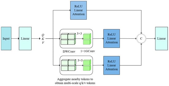 The module structure is shown in Figure 3 below. After the data is input, it first enters the linear layer. After the input data is linearly transformed, three vectors, Q, K, and V, are obtained and then enter three different branches. One is the global attention module, which utilizes two branches. One branch employs a 3 × 3 deep separable convolution (DWConv) and a 1 × 1 grouped convolution (1 × 1 GConv), while the other branch uses a 5 × 5 deep separable convolution (DWConv) and a 1 × 1 grouped convolution (1 × 1 GConv). After aggregating nearby tokens, multi-scale Q/K/V tokens are obtained. Finally, after passing through the global attention module, the similarity between Q and K is calculated to obtain the attention weight. Then, the attention weight is weighted and summed with V to obtain the attention output. The outputs of the three global attention modules are fused at the feature level, and the attention features of different scales are spliced through the connection operation to form a comprehensive feature representation. Finally, after passing through the linear layer, the model’s final output is obtained through a linear transformation.
