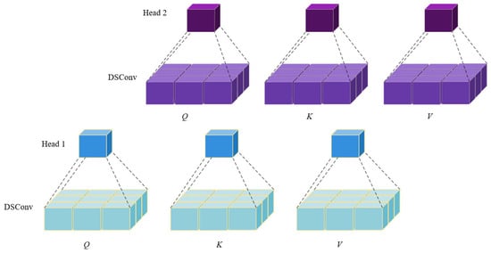 The multi-scale token aggregation process is shown in Figure 4 below. Each Q, K, and V in each head performs independent information aggregation and only uses small kernel convolution for this purpose, which reduces the time spent on model training. Among them, Q = xWQ, K = xWK, V= xWV, WQ, WK, and WV are all learnable linear projection matrices, and the self-attention mechanism formula is as follows: