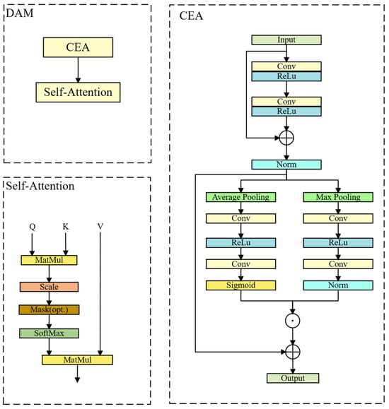 As illustrated in Figure 5, self-attention first enables each spatial location to interact directly with global information, modeling long-distance dependencies. Subsequently, channel-enhanced attention employs a 1 × 1 convolution to expand and then compress the feature channels, extracting rich texture details and simultaneously reducing the parameter count. Average and max pooling are further applied to aggregate spatial statistics, capturing high-frequency information for a more refined channel-wise attention map. The outputs of both branches are concatenated and fused by a 1 × 1 convolution, yielding an enlarged receptive field without a notable increase in computation while preserving spatial details and channel correlations for effective discrimination of power-equipment features.