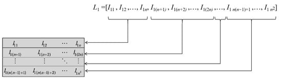 Li et al. [23] introduce the concept of “power-data imaging.” Based on the periodicity inherent in raw power time-series signals, the measured data are reorganized as follows. For the i-th measurement type (i = 1, 2, …, m), let Li = [Ii1, Ii2, …, Iin, …, Ii n2] be the sequence of length n2. Each sequence is first partitioned into non-overlapping segments of length n and reshaped into an n × n matrix, yielding a single-channel image that corresponds to that measurement type. The m single-channel images obtained from the m measurement types are then concatenated along the depth axis, normalized via min-max scaling, and finally converted into a two-dimensional grayscale array. This produces a unified power image that integrates multi-source electrical information. Because the min-max normalization parameters are stored, the original 1-D sequence can be reconstructed without loss. The complete construction pipeline is illustrated in Figure 6.