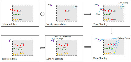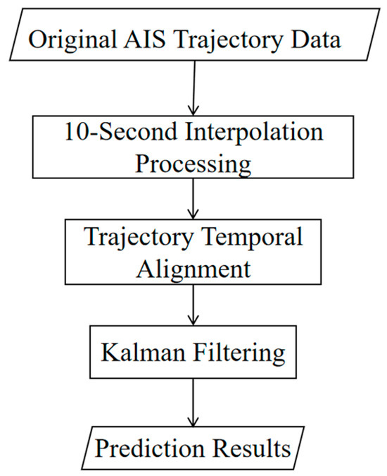 Based on the operational principles of the AIS system, this study adopts a structured AIS data processing framework, as illustrated in Figure 2. Specifically, historical AIS records are fused with newly received data to form the input, which undergoes sequential processing, including initial cleaning, trajectory prediction, and secondary cleaning, ultimately yielding a high-quality AIS dataset. In the initial cleaning stage, incomplete or invalid records––such as those with illegitimate MMSI numbers, abnormal latitude or longitude values, or positions falling outside the video surveillance coverage area—are removed. The trajectory prediction module leverages Kalman filtering and interpolation techniques to supplement trajectory information during periods when no new AIS data are received, ensuring continuity in the vessel motion representation. Since Kalman filtering is better suited for short-term prediction [41], this study adopts a hybrid approach that combines Kalman filtering with interpolation to estimate the vessel’s AIS position at the next time step. The overall prediction workflow is illustrated in Figure 3. Specifically, interpolation is first performed between two consecutive AIS transmissions using their corresponding latitude and longitude values. Within each interval, spatial interpolation is carried out at 10 s intervals to enhance the prediction precision. Subsequently, Kalman filtering is applied to the temporally aligned trajectory for position estimation.