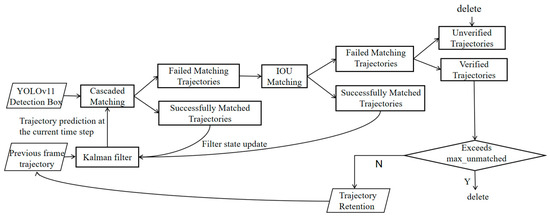In its early stages, multi-object tracking primarily relied on methods such as the Kalman filter and particle filter, using state modeling to maintain inter-frame continuity [12,13]. Subsequently, the tracking-by-detection paradigm became mainstream, combining per-frame object detection with data association algorithms to establish inter-frame correspondences, thereby effectively addressing occlusion and target loss issues [14]. Simple Online and Realtime Tracking (SORT) integrates the Kalman filter with the Hungarian algorithm, providing a lightweight architecture and high computational efficiency [15]; DeepSORT further incorporates appearance features, significantly enhancing its ability to preserve object identities [16]. In recent years, Transformer-based and graph neural network (GNN)-based approaches have emerged, enabling end-to-end modeling and improving adaptability in complex scenarios [17,18].