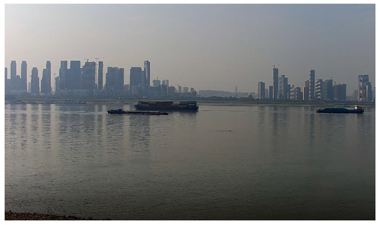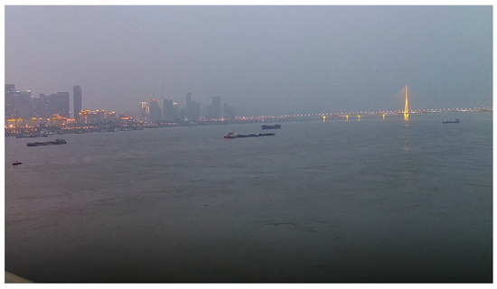 To effectively evaluate the performance of the proposed algorithm, experiments were conducted by matching vessel video trajectories with AIS trajectories. The experimental section of this paper is based on the FVessel dataset [45]. The FVessel dataset consists of 26 videos and corresponding AIS data for specific time periods. The videos in the dataset have a resolution of 2560 × 1440 pixels and were filmed in the Wuhan section of the Yangtze River. Filming locations included bridges and riverbanks, capturing various weather conditions. The total duration of the dataset is approximately 309 min, and it contains data for about 107 vessels. The dataset representation is shown in Figure 5 and Figure 6, where Figure 5 illustrates the riverbank in the Wuhan section of the Yangtze River, and Figure 6 shows a bridge in the Yangtze River basin.