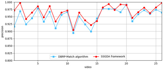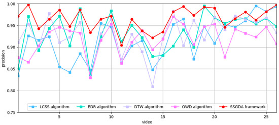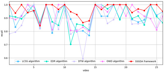 To assess the performance of the SSGDA trajectory-matching method proposed in this paper for matching video trajectories with AIS trajectories, comparative experiments were conducted between the SSGDA framework and several classical trajectory-matching algorithms on the FVessel dataset. The results, including the matching precision and recall rate, are presented in Figure 7 and Figure 8.