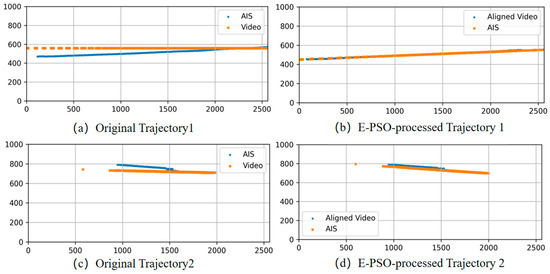 Trajectory similarity computation serves as a fundamental basis for multi-source data fusion. However, in practical trajectory-matching tasks, discrepancies between coordinate systems across heterogeneous data sources often result in inconsistencies in motion patterns, thereby impairing the precision and reliability of similarity evaluation. To address these challenges, this section proposes a customized trajectory-matching framework for fusing AISs and video-derived trajectory data. Specifically, an Enhanced Particle Swarm Optimization (E-PSO) algorithm is employed to explore the rigid transformation parameter space and identify the optimal spatial correction for AIS trajectories. By incorporating an early stopping criterion and a trajectory sparsity-based acceleration strategy, the E-PSO algorithm enables the efficient and precise encoding of rotation angles and translation vectors, thereby improving the alignment between the corrected AIS trajectories and video trajectories in both global configuration and local motion dynamics. On this basis, a distance-based reward–penalty-matching (DBRP-Match) algorithm is introduced to evaluate the trajectory similarity. This method not only identifies optimal matches within a global search space but also effectively mitigates the degradation of the long-range consistency caused by locally optimal yet globally inconsistent alignments.
