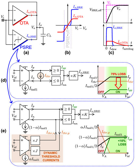 Operating principle of a parallel-type SRE: (a) unity-gain buffer composed of a single-ended OTA assisted by a PSRE; (b) qualitative plots of the output currents of the OTA and PSRE blocks as a function of the differential input signal; (c) qualitative waveforms of the output currents in response to an input voltage step; (d) Nagaraj’s implementation with constant threshold currents [29]; (e) implementation embedding the dynamic-threshold-current (DTC) technique [35], where the constant threshold currents are replaced by signal-dependent currents and .