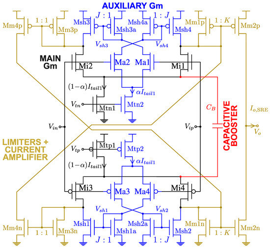 where symbols and indicate the transconductance factors related to the differential pair devices fed by and , respectively. To attain (4), the square-law approximation derived from the EKV model of the MOS transistor was used [38]. The assumption is enforced directly by design through appropriate geometrical ratios for the Mi1–Mi2 and Ma1–Ma2 transistor groups in Figure 2. Specifically, . It is important to emphasize that the aforementioned expressions apply to asymptotic cases corresponding to either pure weak or strong inversion operation. Real-world designs may also operate in the moderate inversion region, where exhibits a dependence on the design parameters and J that lies between the two asymptotic cases. In practical scenarios where PVT (process, voltage, temperature) variations may occur, the actual dependence of on and J can shift within the design space bounded by Equations (3) and (4). It is also worth noting that in the PSRE-assisted OTA, is selected relative to the sensitivity range of the main OTA differential pair (). Therefore, PVT variations tend to affect both parameters similarly, resulting in a first-order robustness of the PSRE activation mechanism.
