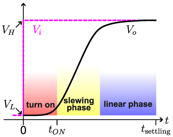 As highlighted in [40], the PSRE current mirrors exhibit a turn-on delay (), degrading settling time. This phenomenon is qualitatively represented in Figure 3, where the total settling time is determined by the sequence of three distinct processes: (i) PSRE turn-on, (ii) slewing phase, and (iii) linear phase. From [40], is estimated to be: