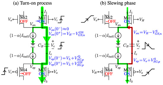 Operating conditions of the CB-PSRE transconductive core during a low-to-high transition of the input voltage, : (a) turn-on process, analysed in Section 3.2, (b) slewing phase, analysed in Section 3.3. Both cases refer to the unity-gain configuration of Figure 1. In both sub-figures, colored arrows indicate currents flowing in each circuit branch.