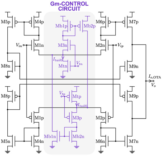 The case-study OTA used in this work employs a rail-to-rail single-stage active-mirror topology. Its complete schematic view is shown in Figure 5. To maintain consistent transconductance () across the full rail-to-rail input common-mode range (ICMR), we implemented a modified -control technique based on [35], which builds upon the approach originally presented in [41].