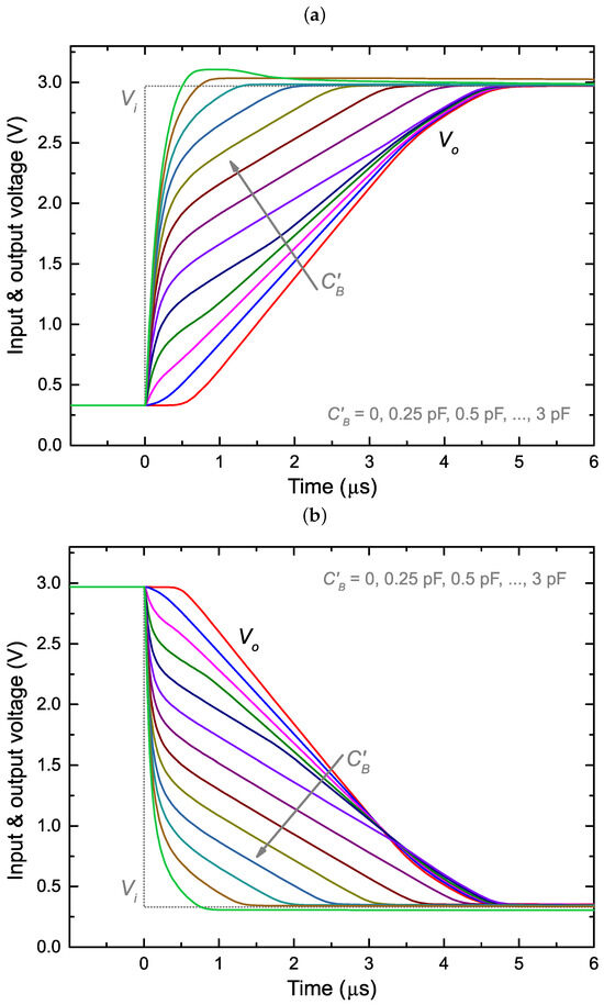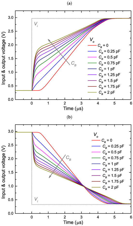 Standard CB technique: input and output voltage as a function of time at the low-to-high transient (a) and high-to-low transient (b), plotted for different values of capacitor .