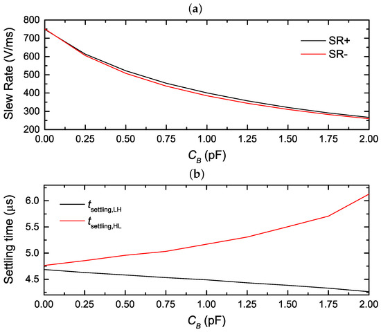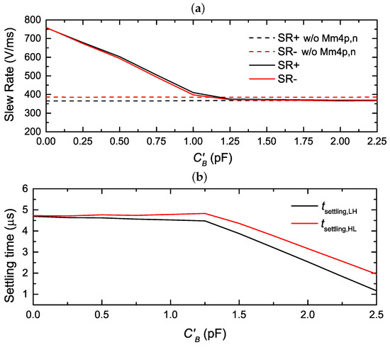 Figure 12a shows the expected SR behavior: after an initial decrease with , SR stabilizes when condition (29) is met; the dashed lines confirm this by showing the SR obtained when the contribution of the differential pair affected by tail current draining is entirely removed (i.e., by removing transistors Mm4p-Mm4n in Figure 10). Corresponding settling time improvements are shown in Figure 12b, where both transition polarities clearly benefit from increased beyond 1.25 pF.