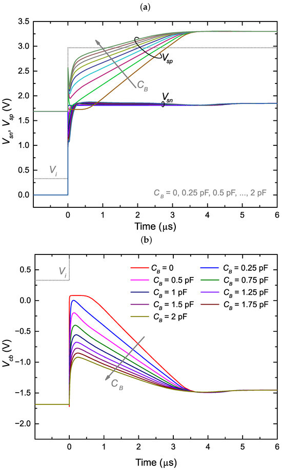 Figure 11a,b illustrate the SCB-PSRE operation during low-to-high and high-to-low transitions, respectively. For small values, the output slope decreases according to (28) and (30), while maintaining the beneficial initial boosting effect. When exceeds ∼1.25 pF, the slope becomes constant as predicted by (28) and (30), with only one differential pair contributing current during the whole transient, while the tail current of the other differential pair is entirely drained by the dynamic current flowing through its related CB element. Isofar, a limit is set to the SR degradation phenomenon seen with the standard CB technique, while settling time remarkably decreases as a function of , thanks to increased initial steps. However, excessive (>2.25 pF) eventually causes overshoot, due to delayed PSRE turn-off. The delayed turn-off of the PSRE causes excess output current into , eventually degrading the settling time (). A similar phenomenon has been analyzed in [40].